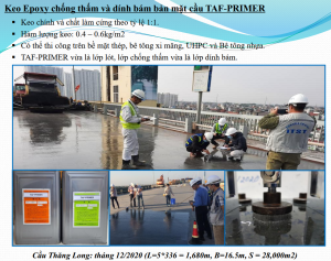 *) TAF-PRIMER® là keo Epoxy dẻo nhiệt hai thành phần có tác dụng chống thấm và tạo liên kết bền vững giữa bản mặt thép hoặc bản BTXM với lớp Bê tông nhựa.