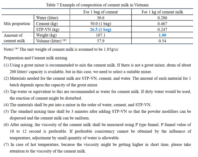 | Cách dùng | Trộn xi măng PCB40 + Nước sạch + STP-VN tại hiện trường theo tỷ lệ qui định. |