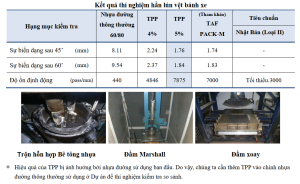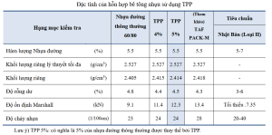 Các đặc tính cuả hỗn hợp bê tông nhựa đường sử dụng phụ gia TPP 4% hoặc 5% được trình bày dưới bảng sau. Hỗn hợp nhựa đường được sử dụng trong thí nghiệm này là hỗn hợp bê tông nhựa chặt và có đường kính cốt liệu tối đa là 13mm.