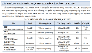 Đối mặt với hiện tượng HLVBX từ năm 1979, và sản phẩm đầu tiên của chúng tôi là “TAF-PACK” đã được phát triển thành nhựa đường cải tiến. Cho đến nay, sản phẩm này đã không ngừng được nâng cấp và phát triển. Từ kỹ thuật ban đầu đã phát triển thành TPM, TPS và TPP. Hơn nữa, chúng tôi còn có phương pháp đặc biệt khác nhằm khắc phục HLVBX như bảng dưới đây.